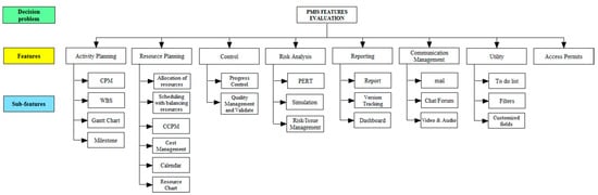 One hundred and fifty-two PMIS features were initially identified by the literature review and the analysis of PMIS packages. The hierarchical representation of this initial list is reported in the Appendix A, where the description of every feature/sub-feature is also given along with the main references and the software in which they are implemented. Involving the panel of experts, the number of features/sub-features was reduced to 82 by removing redundancies and/or grouping the similar ones. In this regard, some features and sub-features were discarded (e.g., “Interdependencies Management” was considered to be negligible) or merged and/or renamed (e.g., “Budget Control” and “Time Control” sub-features). The resulting hierarchical structure is reported in Figure 3, whereas detailed and modified descriptions of features/sub-features are included in Appendix B.