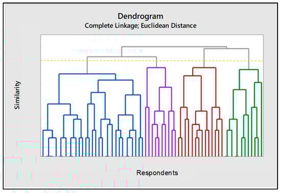 The first survey was administered to 75 professionals, and a total number of 67 responses was received. As reported in Section 3.2.1, the number of clusters was identified by cutting the dendrogram obtained for every feature/sub-feature at a particular level of similarity. As an example, the dendrogram of “Resource Planning” obtained by Minitab© is shown in Figure 4. Four clusters were chosen, where the cutting level is the one represented by the orange dashed line and the four clusters are differently colored.