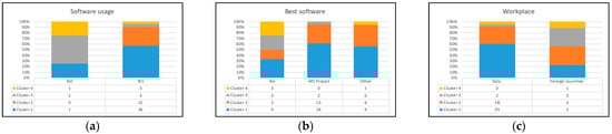 On the basis of the last column of Table 3, “Activity Planning” and “Access Permits” were found to have the highest and lowest importance, respectively. On the other hand, different opinions were observed when comparing feature weights related to every cluster. Therefore, the interactions between respondents’ profiles (see Appendix B) and PMIS functionality weights were verified using the χ2 metric. In particular, taking into account all 67 responses, the distribution of respondents in clusters 3 and 4 was observed to be significantly different from the others in respect to the software usage and best software (Figure 5a,b). It means that a lot of respondents that do not use software or for which the best software does not exist are present in these clusters. Figure 5c shows that the frequency of foreign respondents in clusters 3 and 4 is switched. In detail, cluster 3 was characterized by a higher presence of foreign respondents in proportion to the total.