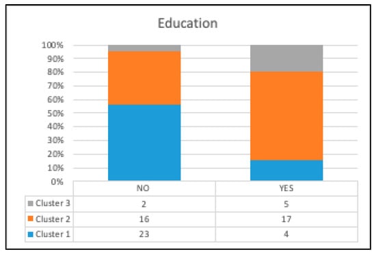 Considering the χ2 metric for the sub-features of “Activity Planning”, “Resource Planning”, “Control”, “Reporting”, “Communication Management” and “Utility”, no significant interactions between weights and clusters were observed. As a consequence, the corresponding histograms are not reported. On the other hand, a significant interaction between clusters of “Risk Analysis” and respondents’ education was observed (Figure 6), because of the higher relative frequency of educated respondents in cluster 2 than the other clusters. The corresponding weights per cluster are given in Table 5.