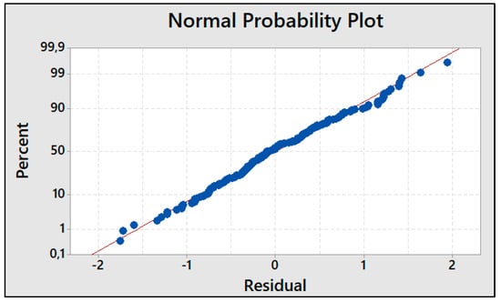 The residual analysis (Figure 7)—performed on 192 ratings—confirmed the acceptability of the assumption of normality, which the regression model was based on. The goodness of fit was quite high (R2 = 83.91%; R2adj = 76%).