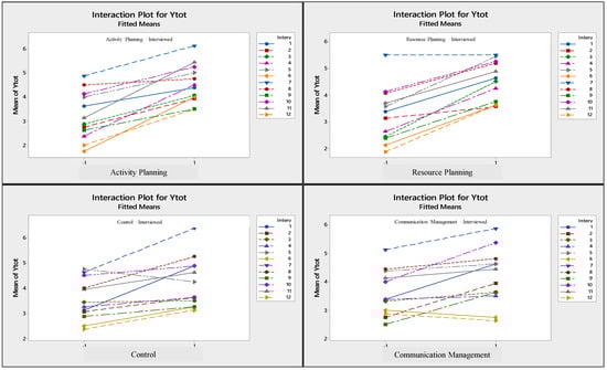 Figure 8 only shows those scenarios where significant interactions between features and the interviewed were observed. For instance, respondents 4 and 12 gave higher ratings to prototypes when “Activity Planning” was included. In detail, respondents 4 and 12 are both male, use PMISs software and they do not have any certification. With relation to “Control”, respondent 5 gave an opposite rating in comparison with the others, providing a high increase with relation to “Resource Planning”. Respondent 5 works in an IT company, uses software and he/she is trained in project management. On “Communication Management”, respondents 6 and 12—having more than 10,000 h of project management experience—provided an opposite rating in respect to the other respondents.