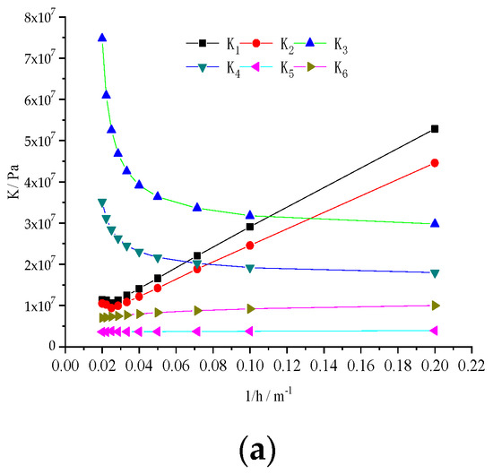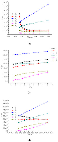 Influences of various factors on foundation spring stiffness: (a) K versus 1/h, (b) K versus 1/H, (c) K versus d, (d) K versus 1/b, (e) K versus E, (f) K versus υ.