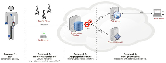 • Self-sufficiency: the system allows that data acquired by sensors to be processed either “locally” or on a remote site. Local processing makes it possible for the sensing system worn by a subject to run autonomously—although possibly in a degraded mode—when no communication network is available. In contrast remote processing makes it possible to run advanced (CPU intensive) algorithms on the data acquired by the sensors. An aggregation server for data collection. This segment, like the previous one, is equipped with all the necessary means for encryption and data security.