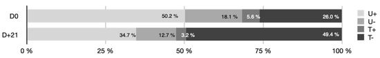 The first result shows that the raw frequency of occurrence of each response category differs significantly between D0 and D + 21. Indeed, the dispersion of responses reveals a complete inversion of the participants’ positioning (Figure 3).