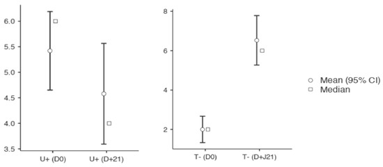 Finally, the main role of each participant (using the answers they gave) was categorized for each measurement time: those with a majority of “U”-oriented answers were identified as participants in the role of future users. Those with a majority of “T” responses were identified as participants in the role of tester. When it was not possible to identify a majority role, the most frequently answers were used to select the role associated with it (one case at D0 which used the answer U+ three times out of six). If there was no majority response, the participant was removed from the analysis (one case at D + 21).