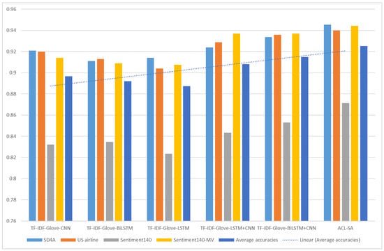 For simplicity, Table 7 and Figure 2 summarize the proposed model’s accuracy with the aforementioned neural networks and datasets. It depicts that the proposed ACL-SA model successfully attained the highest accuracy with our structured dataset. In comparison, the average accuracy comparison of our proposed model with the existing models for all datasets is differentiated with the following inequality expression: