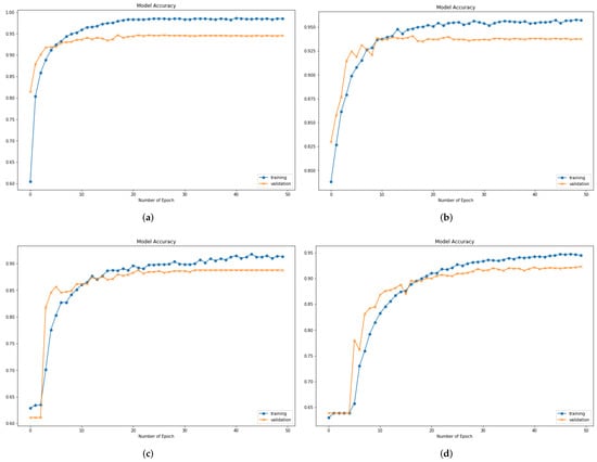 As mentioned in the literature [,], overfitting, a critical challenge in deep learning models, reduces the model’s accuracy and performance. However, this challenging task is resolved by utilizing the Gaussian Noise and Gaussian Dropout on different Twitter datasets. Figure 2 presents the convergence of our proposed model that attained a reliable accuracy based on experiments conducted on training and validation datasets with 50 epochs and a batch size of 256. For instance, in Figure 3a, the SD4A validation data are initiated from an accuracy of 0.814, steadily increasing to 0.935 at epoch 10, and remains constant for all other epochs.