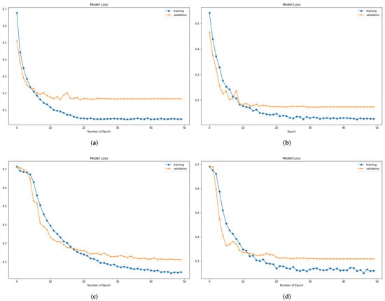 Meanwhile, the training data accuracy fluctuates from 0.60 and increases steadily to 0.952 with epoch increment. At the same time, it became constant after the 15th epoch. Similarly, Figure 3b presents the accuracy trend of training and validation of the US airline dataset. It provides a rapid accuracy curve of 10 epochs starting from 0.839 to 0.938 on the validation set. For the training set, it starts from 0.788 to 0.94, which becomes constant after 10 epochs. Figure 3c,d show that the accuracy trends for the sentiment140 and sentiment140-118 k datasets are slightly different from SD4A and US-airline datasets. Figure 3c shows that the accuracy trends for the sentiment140 dataset improved smoothly from 0.75 to 0.89 for epochs 5 to 20. Later, it is constant on average for both training data and validation data. On the other hand, in Figure 3d, we observed that the training and validation results of the Sentiment140-MV dataset could not attain accuracy in epochs 0–5. Later, it increased with the number of epochs and became constant after epoch 30. Apart from these analyses, our proposed model significantly combatted overfitting in all different datasets. As a result, the training dataset’s accuracy is slightly higher after the 20th epoch than the validation or test dataset in all datasets—while, for initial epochs, the test data’s accuracy is a bit higher. Figure 4 likewise shows the loss value to confirm the combatted overfitting effect of our model on the four Twitter datasets. From the figure, the loss of our models in training and validation sets shows a decreasing trend with the increase of epochs and finally reaches a lower value and becomes stable. For instance, in Figure 4a, the loss of SD4A validation data starts from 0.5106, steadily decreasing to 0.1764 for 10 Epochs, and then becomes stable for all other iterations. Figure 4b presents the loss trend of training and validation of the US-airline dataset. It provides a rapid loss curve of 10 iterations starting from 0.4669 to 0.1835 on the validation set and becomes stable. Figure 4c,d belongs to the loss rate of sentiment140 and Sentiment140-MV, respectively. The loss validation rate starts from 0.6919, decreasing the trend to 0.3293 for sentiment140. Similarly, loss validation for Sentiment140-MV starts from 0.7091 and steadily decreases to 0.2289. In both, the loss trends for the validation set become stable after 20 epochs.