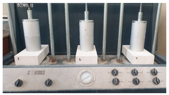 A total of 12 test sets were created—3 with the applied bitumen screed, 3 with the applied polymer screed, 3 with the applied silicate (mineral) screeds, and 3 without any treatment (reference specimen). Each of the waterproofing materials was applied to three test specimens to verify the functionality of the experiment. Another three specimens were left without a screed or screeds as reference specimens (Figure 3b).