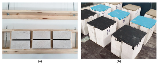 For these purposes, special test specimens—sets consisting of two bricks connected by mortar—were created. The lime-cement (mixture of cement clinker, cement dust, inorganic fillers and refining additives) mortar was used for joining the bricks. Each specimen was made up of two halves of the brick—145 × 140 × 65 mm (the original size of the brick had been modified with respect to the dimensions of the test equipment). The overall dimensions of the test specimens were thus 145 × 140 × 145 mm. For further testing, it was important to create a perfectly flat surface on which the waterproofing screeds would be further applied. That is why wooden formwork was created (Figure 3a).