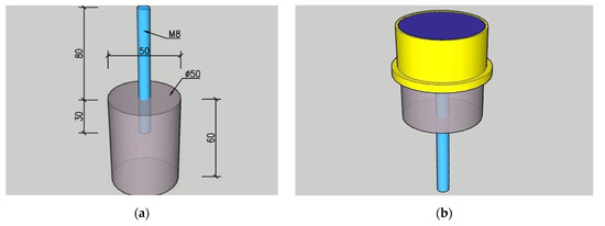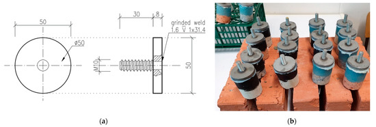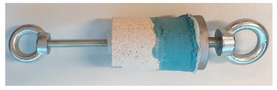 During the tear-off tests, it was necessary to ensure the axial loading. The tension was exerted by a steel ring which is screwed onto the threaded rod. A similar fastening system was used on the opposite side (Figure 9 and Figure 10).