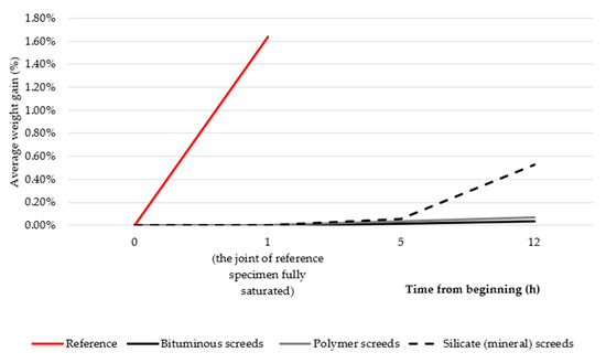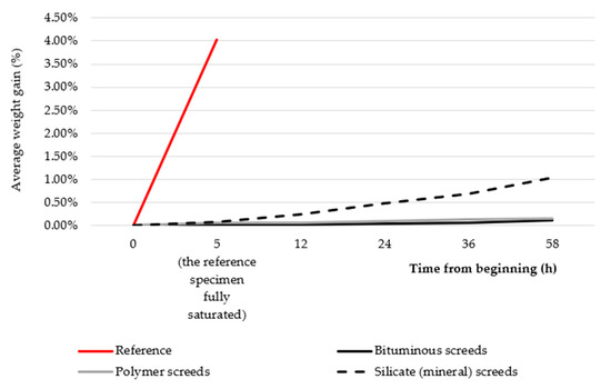 The waterproofing ability of all types of tested screeds applied on all tested building structures was shown during the test. The maximum level of water pressure (reached in the last phase of loading) corresponded to 0.24 MPa (24 m of hydrostatic pressure). The results verified the values in the technical data sheets of the manufacturers but there were some differences in their properties among each other. In the case of the reference specimen, there was a percentage weight gain of 4.02% in 5 h. After 5 h of loading by water, the results manifested almost no effect on any of the tested screeds.