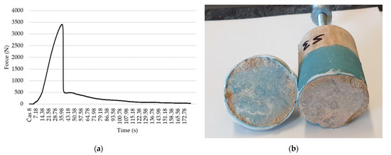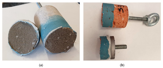 After the tear-off test, the type of failure was observed. The failure manifested itself at the screed-substrate interface. It can be called “an adhesive failure” (Figure 13b). In some cases, the screed itself was broken, which can be called “a cohesive failure” (Figure 14a).