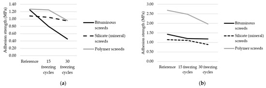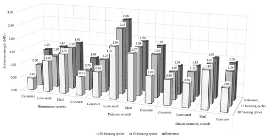 The effect of the freezing cycles on the screed’s adhesion is the most significant between 15 and 30 cycles. Here, the difference between bitumen and silicate (mineral) screeds can be observed. Comparing the reference specimen and the tested specimen after 15 freezing cycles, there was a loss of adhesion to 94%, and, after another 15 cycles, the original strength had dropped to 75%. Thus, the total loss between 15 and 30 cycles was 19%. The results showed a significant effect of the number of freezing cycles on the adhesion to the substrate. On the other hand, the measured adhesion values after the cycles are performed are higher than the values of the other screeds for the reference specimens. Hence, it can be noted that the adhesion is sufficient for use in construction, often higher than the strength of the base material. The polymer screed has the lowest durability against freeze-thaw cycles (in comparison to the other tested screeds).