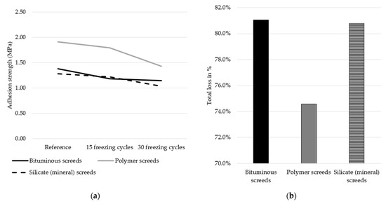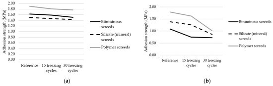 (a) Average adhesion strength without the influence of the substrate; (b) average residual strength after 30 freezing cycles without the influence of the substrate [%].