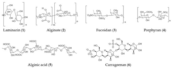 Brown seaweeds are more highly enriched with polysaccharides than other seaweeds, such as yellow and green seaweeds. These polysaccharides from brown seaweeds have attracted great attention owing to their therapeutic effects on cancers. The structures of polysaccharides are shown in Figure 1. Polysaccharides are composed of laminarin (1), alginate (2), fucoidan (3), and their derivatives. Some species of brown seaweed also contain a small amount of porphyrin (4) [] and alginic acid (5) derivatives that exhibit anticancer potential and can be utilized as a drug delivery system. Meanwhile, some species of red seaweeds contain carrageenan (6), which contains sulfated polysaccharides, and are used as stabilizers, gelling agents, binders, and additives in the food and pharmaceutical industries []. Seaweed polysaccharides possess similar repeating units of carbohydrates with different sulfation and molecular weights. The composition of sulfated polysaccharides and their biological activities are related to different isolation techniques and habituating areas []. For instance, fucoidan is a long-chained sulfated polysaccharide that is widely isolated from different seaweed species, such as Undaria pinnatifida, Laminaria japonica, and Fucus vesiculosus []. In particular, the dry weight of Sargassum spon. and Focus sp. contained 8% to 12% fucoidan polysaccharides. The complex sulfated polysaccharides of fucoidan are also composed primarily of sulfated L-fucose and a small amount of glucose, mannose, xylose, and rhamnose [].