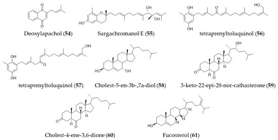 Figure 5 shows structures of quinones and sterols isolated from seaweeds. Deoxylapachol (54) and 1,4-naphthoquione derivatives isolated from Landsburgia quereifolia demonstrated cytotoxicity against P-388 leukemia cells []. Bis-prenylated quinon, extracted from the brown alga Perithalia capillaris, showed antiproliferative effects against HL-60 cells (IC50 0.34 uM) []. Sargachromanol E (55), obtained from Sargassum siliquastrum, inhibited growth of HL-60 cells via caspase-3 dependent apoptosis induction. These results indicate that DNA fragmentation leads to the accumulation of cells in the sub-G1 phase. Furthermore, sargachromanol E reduced Bcl-xL expression and enhanced Bax expression []. Tetraprenyltoluquinols (56) and (57) were found in Cystoseira crinita brown algae [,]. The compounds successfully inhibited the growth of HMO2, HepG2, and MCF7 cancer cell lines by inducing cell death [].