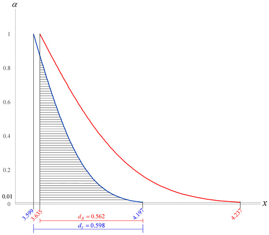 where . According to Buckley [26], the area of is adopted as the numerator and the area of as the denominator. Besides, the fuzzy test is performed based on the ratio of . Some scholars think that the calculation of this ratio is relatively difficult and therefore can be replaced by the bottom-line length ratio [27,28]. First, let be the bottom length of . Based on Equations (19) and (20), can be displayed as follows: