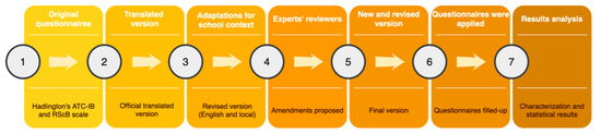 The methodology delineated to define and adjust the questionnaires is depicted in Figure 2. Two questionnaires were deployed and applied, namely, Cybersecurity Behaviors in Schools (CsB-S), and Cybersecurity Attitudes in Schools (CsA-S). The starting point to delineate these questionnaires was the identification of state-of-the-art questionnaires adopted for similar research. Hadlington’s RScB and ATC-IB [6] were selected, as they were already applied in similar contexts. The findings attained with recent work developed by the authors [25], in which similar questionnaires were applied in health institutions to evaluate health practitioners’ cybersecurity attitudes and behaviors, were also considered in the decision.