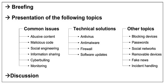 Figure 5 depicts the overall alignment of the defined lesson plan. The lesson starts with a briefing to the subject, followed by the presentation of a list of topics, classified into three main groups: Common issues, technical solutions, and other topics. After the lecture, a debate follows for discussion of topics learned.