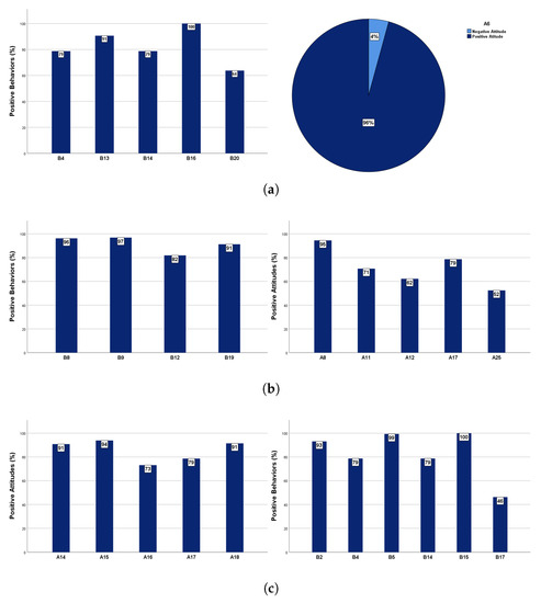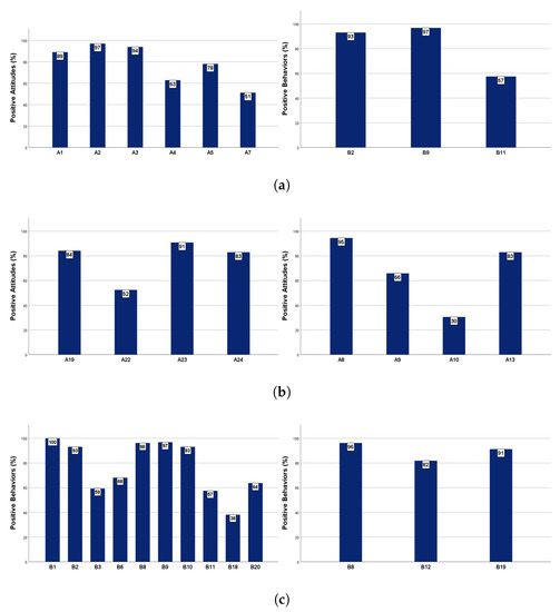 Findings: attitudes and behaviors. (a) Finding 05—attitudes and behaviors. (b) Findings 06 and 07—attitudes. (c) Findings 08 and 09—behaviors.