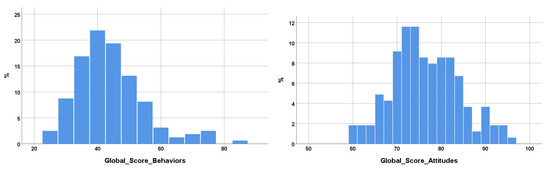 The distribution of the global score of attitudes and behaviors is depicted in Figure 8, where the values range between 20 and 140 for the behaviors and between 25 and 100 for the attitudes. Low values represent positive behaviours, while high values represent good attitudes. It is possible to observe a positive skewed distribution on the behavior scale, where 75% of the students obtained a global score up to 50, which shows a globally positive behavior attained. Regarding attitudes, a mean (standard deviation) global value of 76 (7.7) was obtained, showing that globally students presented positive attitudes.