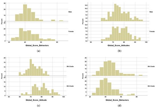 In Figure 9a,c the distribution of the global scores attained for attitudes by grade are represented, and concerning both significant differences were observed (global behavior: t = −2.731, p = 0.007; global attitude: t = 6.035, p < 0.001), and it can be observed that students of 6th grade showed to have higher positive attitudes and behaviors. This fact may infer the need to invest more in cyberawareness in the 9th grade students. The fact that these students have more information and apparently have more experience with the electronic devices and digital applications may give them a more relaxing attitude regarding cyberawareness.
