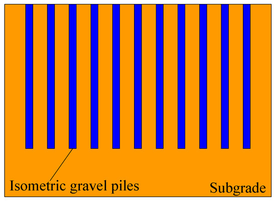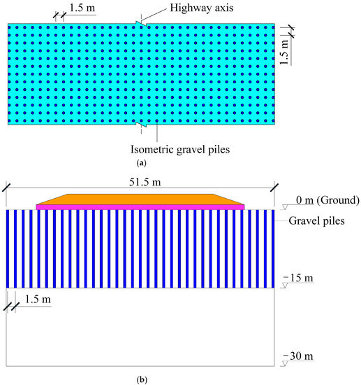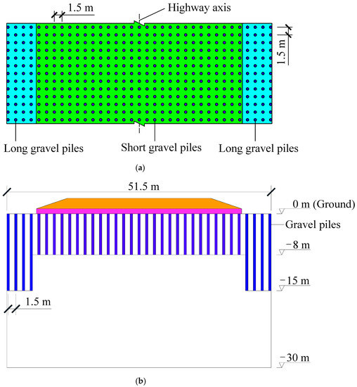 The planar layout and cross-sectional layout of the isometric gravel piles scheme are shown in Figure 4a,b. Meanwhile, the plan layout and cross-sectional layout of the subarea long-short gravel piles scheme are shown in Figure 5a,b.