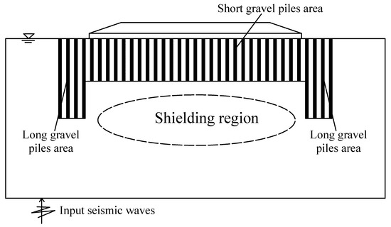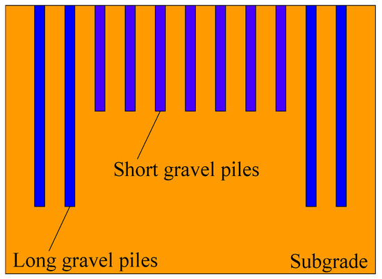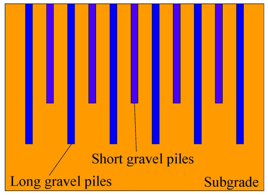 Although isometric gravel piles can improve the bearing capacity and anti-liquefaction ability of soft foundation, their implementation may lead to higher construction costs. Therefore, implementing a combination of long-short gravel piles has been discussed. This scheme is referred to as interphase gravel piles in this paper, and it is shown in Figure 2.
