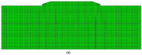 Three-dimensional finite element models of the natural foundation, foundation with the isometric gravel piles reinforcement scheme, and foundation with the subarea long-short gravel piles reinforcement scheme are shown in Figure 6a–c, respectively.