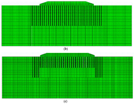 Finite element models of the natural foundation and foundations with the two studied reinforcement schemes. (a) Natural foundation. (b) Foundation with isometric gravel piles scheme. (c) Foundation with subarea long-short gravel piles scheme.