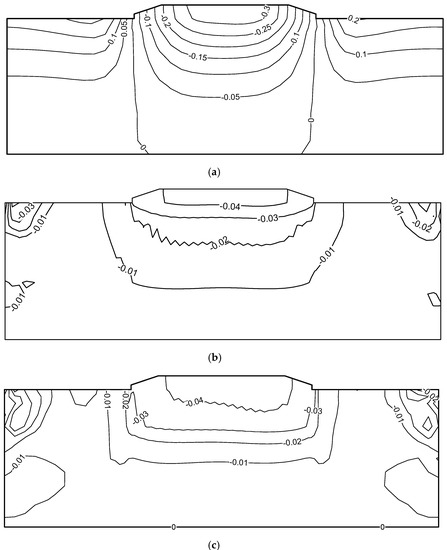 Contours of seismic subsidence of natural foundation and reinforced foundations. (a) Natural foundation. (b) Foundation reinforced with isometric gravel piles. (c) Foundation reinforced with subarea long-short gravel piles.