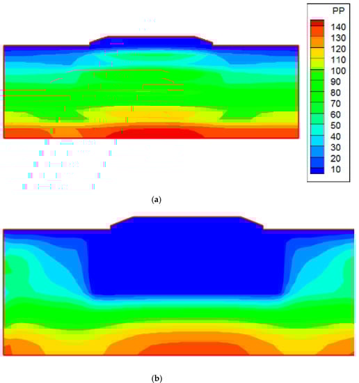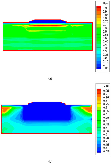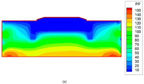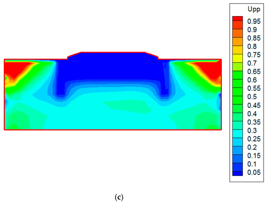 Twenty seconds into an earthquake, the dynamic excess pore water pressure distribution in natural foundation, foundation reinforced with isometric gravel piles, and foundation reinforced with subarea long-short gravel piles in the deeply deposited saturated liquefiable soil are shown in Figure 9a–c, respectively.