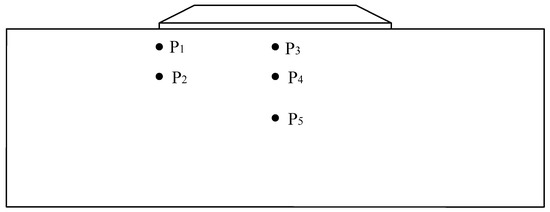 In order to analyze the time histories of dynamic excess pore water pressure, two observation points, P1 and P2, were selected at depths of 3.0 m and 8.0 m, respectively, below the left edge of the embankment. Then, three observation points, P3, P4, and P5, were selected at depths of 3.0, 8.0, and 15.0 m, respectively, in the middle of the subgrade. The observation points and their placements are shown in Figure 10.