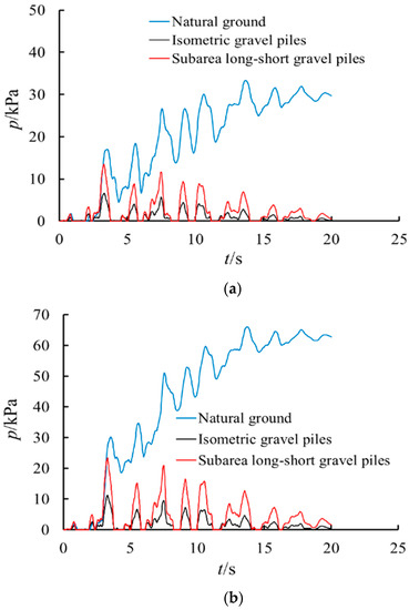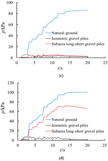 The time histories of dynamic excess pore water pressure in natural foundation, foundation reinforced with isometric gravel piles, and foundation reinforced with subarea long-short gravel piles, in the deeply deposited saturated liquefiable soil during an earthquake, are shown in Figure 11.