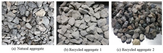 Two types of RCAs (RCA1 and RCA2) with a nominal maximum aggregate size of 25 mm were selected from the RCA processing plant: RCA1 from a concrete road and RCA2 from unknown sources. As a result of visual inspection, no foreign substances other than aggregate, mortar, and concrete were found in the RCAs. The RCAs were transferred to the laboratory in ton bags, and were classified by size (9.5, 13, 19, and 25 mm) to evaluate material properties for each size. Water absorption and specific gravity were performed as per KS F2503 [37]. The aggregates used in the study are shown in Figure 1 and the material characteristics are summarized in Table 1. The average specific gravity and water absorption of RCA1 were 2.41 and 5.28%, and for RCA2 of 2.53 and 2.54%, respectively.