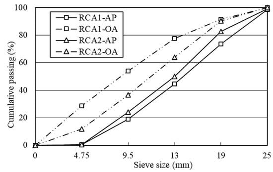 - RAC-AP: Concrete in which the RCA with a particle size range of 4.75–25 mm was manually fitted to the same particle size curve as OA (4.75–19 mm) (i.e., 19 mm is its apparent size).