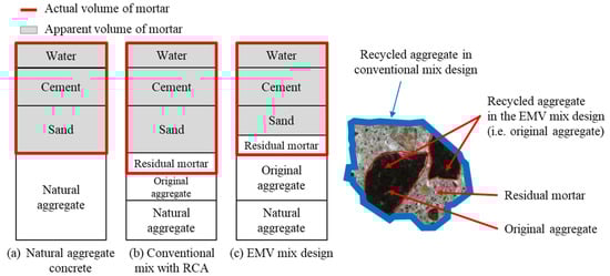The EMV mix design was proposed by Fathifazl [43] to improve the properties of RAC. Figure 3 shows the mix proportions of NAC and RAC designed by the conventional mix design and the EMV mix design. In the conventional mix design, RCA itself is considered as a coarse aggregate. For this reason, the author noted that the mortar volume of RAC produced by the conventional mixed design method was larger than that of NAC. The main feature of the EMV method is to consider the residual mortar of RCA as part of the mortar of concrete. Therefore, RAC made with the EMV mix design has the same mortar volume as NAC (see Table 2). A detailed description of the EMV mix design can be found in [28,43].