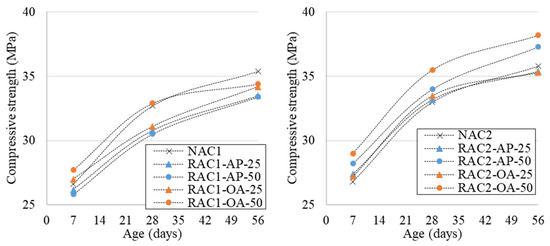 The 7-day compressive strength of RAC1 was in the range of ±3% of that of the control concrete, NAC1. However, after 28 days, only RAC1-OA-50 exhibited similar behavior to the reference specimen, and about 5–7% strength loss was observed with the other RAC1 mixes. Additionally, at 56 days, all RAC1 mixes showed lower compressive strength than NAC1, with a loss percentage of up to 6%. These decreases in strength practically mean a shift of one strength class (e.g., at a strength of 30 MPa (strength class 30 according Korean standard), a decrease in strength of 7% is 2.1 MPa; the resulting value of 27.9 MPa can be assigned to strength class 27). For RAC2, nearly similar and even higher compressive strength than that of NAC2 were observed at all ages. At seven and 28 days, the compressive strength of the RAC2 mixture was 1–8% higher than that of the control mixture, NAC2. At 56 days, the compressive strength of the RAC2 mixture was in the range of 99–107%. This can be attributed to the fact that the quality of the RA used for the RAC2 series is superior to that of the RA used in the RAC1 series. The RA quality is a major factor influencing the compressive strength of concrete, which is also in effect in concrete made by the EMV mix design [31]. In general, RAC causes a significant loss of mechanical strength depending on the RA replacement rate [32,55], but the EMV method allows it to achieve a mechanical performance similar to that of NAC. These results are consistent with other several studies [56,57].