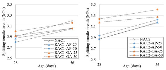 The test results of splitting tensile strength for each RAC at 28 and 56 days are shown in Figure 5.