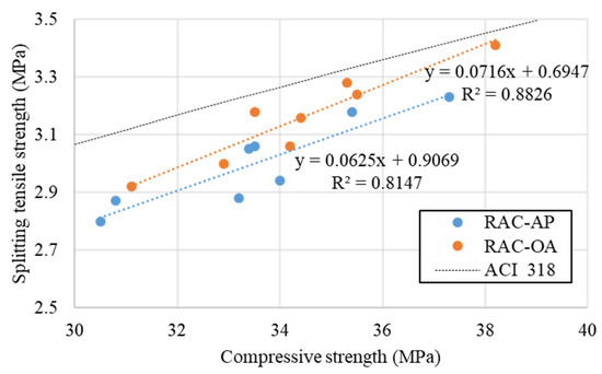 In Figure 6, the RAC1 and RAC2 were integrated into RAC, but were divided into the AP and OA series to evaluate the effect of maximum aggregate size. In the case of the RAC-OA series, in which concrete was manufactured based on the size of OA, a higher value of tensile strength was clearly observed than that of RAC-AP based on the size of RA itself at the same compressive strength level, but the ACI equation clearly overestimated the tensile strength obtained in all RAC mixtures. Although a low correlation coefficient (less than 0.5) between compressive strength and tensile strength has been observed in some studies [58], the RACs used in this study had good correlation coefficients (0.81 and 0.88). In particular, it is worth mentioning that a higher correlation coefficient was observed in the RAC-OA series, where the particle size distribution was determined based on OA. Therefore, when concrete is manufactured based on OA particle size, the properties of concrete can be more predictable.