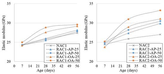 The elastic modulus of the concrete mixes at 7, 28, and 56 days are given in Figure 7. Except for RAC1-AP-50 at 28 days, all concrete mixes showed higher values of elastic modulus than the control mix at 28 and 56 days. The RAC1-AP series had an elastic modulus in the range of 99–107% of NAC1, and the RAC1-OA series was in the range of 107–112%. Compared with the control concrete (NAC2), the 28-day modulus of the RAC2-AP series with high-quality RA was 6% and 9% higher at 25% and 50% mixing rates, respectively, and the RAC2-OA series was 12% and 20% higher at the corresponding replacement levels.