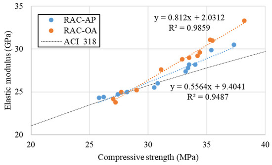 The R2 values of RAC-AP and RAC-OA were both above 0.9, indicating that there were very strong correlations between compressive strength and elastic modulus. This could have a strong practical benefit for the prediction of elastic modulus based on compressive strength, since the strength test is standard, while the elastic modulus test is more technical and time-consuming. In the RACs used in this study, higher elastic modulus values than the prediction model were observed. However, according to the trend line, this equation might overestimate the modulus at a lower strength. At the same value of compressive strength, the RAC-OA series exhibited a higher elastic modulus than the RAC-AP series.