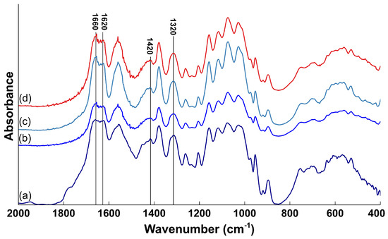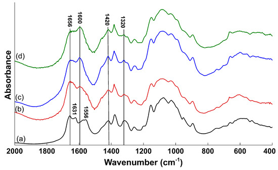 In a previous study [9], we analyzed the different steps of the extraction process (i.e., demineralization, deproteinization and decolorization) from cicada sloughs collected in 2017. The FTIR characterization showed that the raw material and the demineralized sample presented a single peak at approximately 1660 cm, while after the deproteinization two individual peaks appeared at 1620 cm and 1660 cm. This phenomenon was attributed to the removal of proteins since the peak at 1660 cm might be assigned to the amide I vibrational modes [12]. Furthermore, the presence of two individual peaks also suggested that the extracted chitin was the -polymorph, while the presence of a single peak is attributed to the -polymorph [13]. In order to validate these observations, we collected the FTIR spectra of the raw material and of the intermediary products of the extraction of chitin from cicada sloughs harvested in 2019 and 2020—see Figure A1. We found that the FTIR spectra for the extractions performed on cicada sloughs harvested in 2019 and 2020 are very similar to each other. In both the extraction processes, the raw material and the demineralized product present only one peak at 1660 cm while two peaks appear at 1620 cm and 1660 cm for the deproteinized and decolorized products, confirming that proteins were efficiently removed, and that chitin is in its -polymorph.