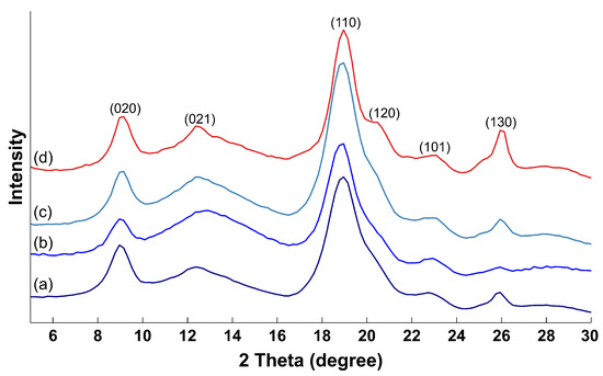 XRD spectra of CH-17 (a), CH-19 (b), CH-20 (c) and of a commercial chitin (d).