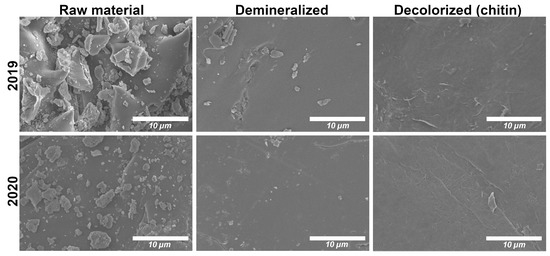 SEM images of raw material, demineralized and decolorized samples harvested in 2019 and 2020.