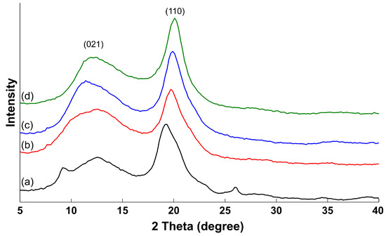 where is is the maximum intensity the (110) diffraction peak in the crystalline region at 20° and is the maximum intensity of amorphous diffraction at 16°.