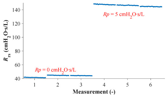 The measurements of Rrs in our experiment are summarized in Figure 2 and Table 1. Measurements 1–3 correspond to no added resistor and measurements 4–6 correspond to the phase of the experiment with the added resistor Rp. Three demijohns representing different compliances (37, 24, and 17 mL/cmH2O) were used in both phases of the experiment. The resistance Rrs substantially increased by more than 100 cmH2O∙s/L (over 220% increase) after the addition of the resistor to the model of the respiratory system (the change between Section 3 and Section 4). The change in the compliance value did not have a substantial effect on the measured Rrs values as the mean Rrs did not differ for more than 4 cmH2O∙s/L (less than 10%) when Rp remained unchanged.