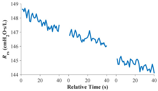 Figure 4. The course of computed Rrs during ventilation of the respiratory system model with added resistor Rp5 (three 40 s long measurements correspond to measurement sections 4, 5, and 6 in Figure 2). Three glass demijohns with different compliance (37, 24, and 17 mL/cmH2O) were ventilated to investigate the effect of compliance on the measured resistance of the respiratory system.
